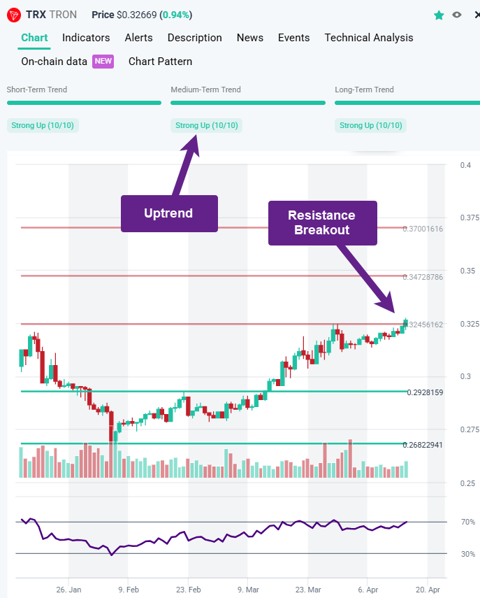 Here’s an example of an asset that just broke through its resistance and appears poised to continue its existing uptrend.