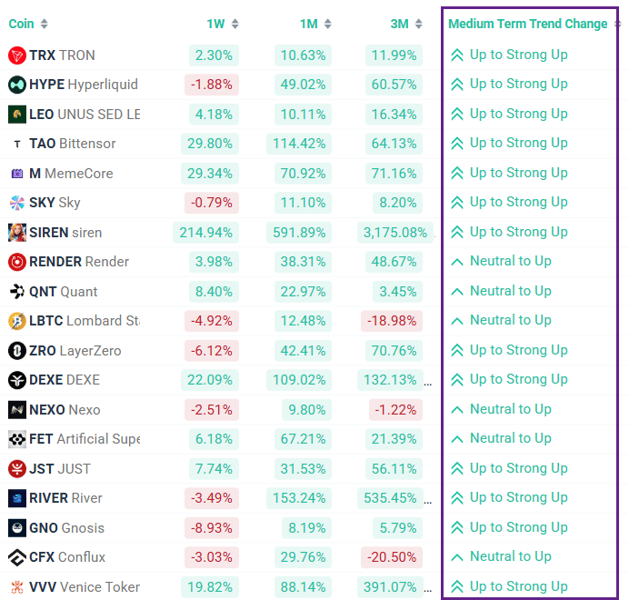 Here's a market scan that finds coins with a recent trend reversal signal: upgrade in Medium-Term trend to Uptrend (see results). These are assets with relatively fresh uptrend that traders could ride much higher: