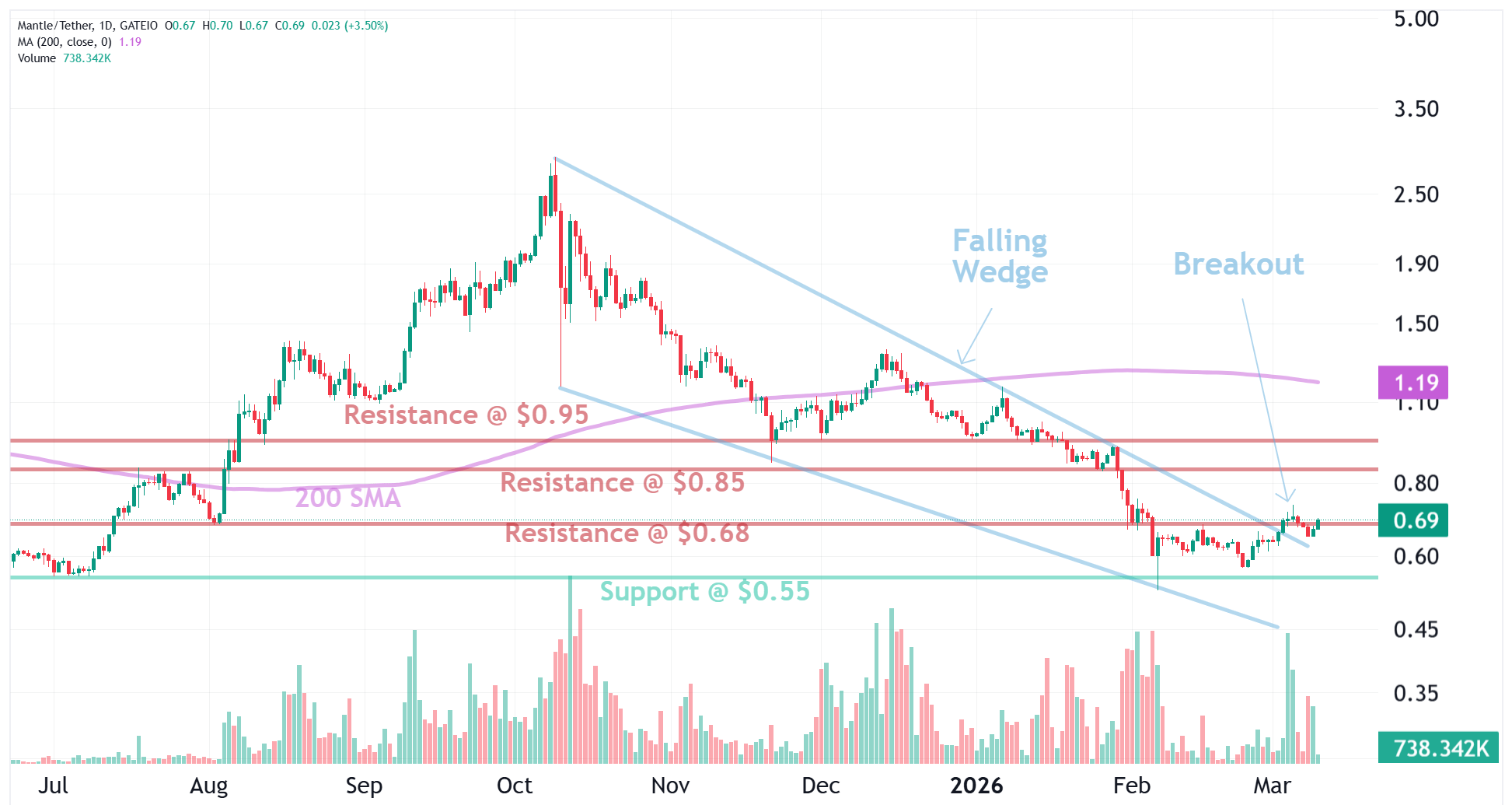 MNT Trade Setup: MNT looks interesting. It broke out of a Falling Wedge, which signals at least a temporary bullish trend reversal. It broke above $0.68 resistance and now it’s testing that.
