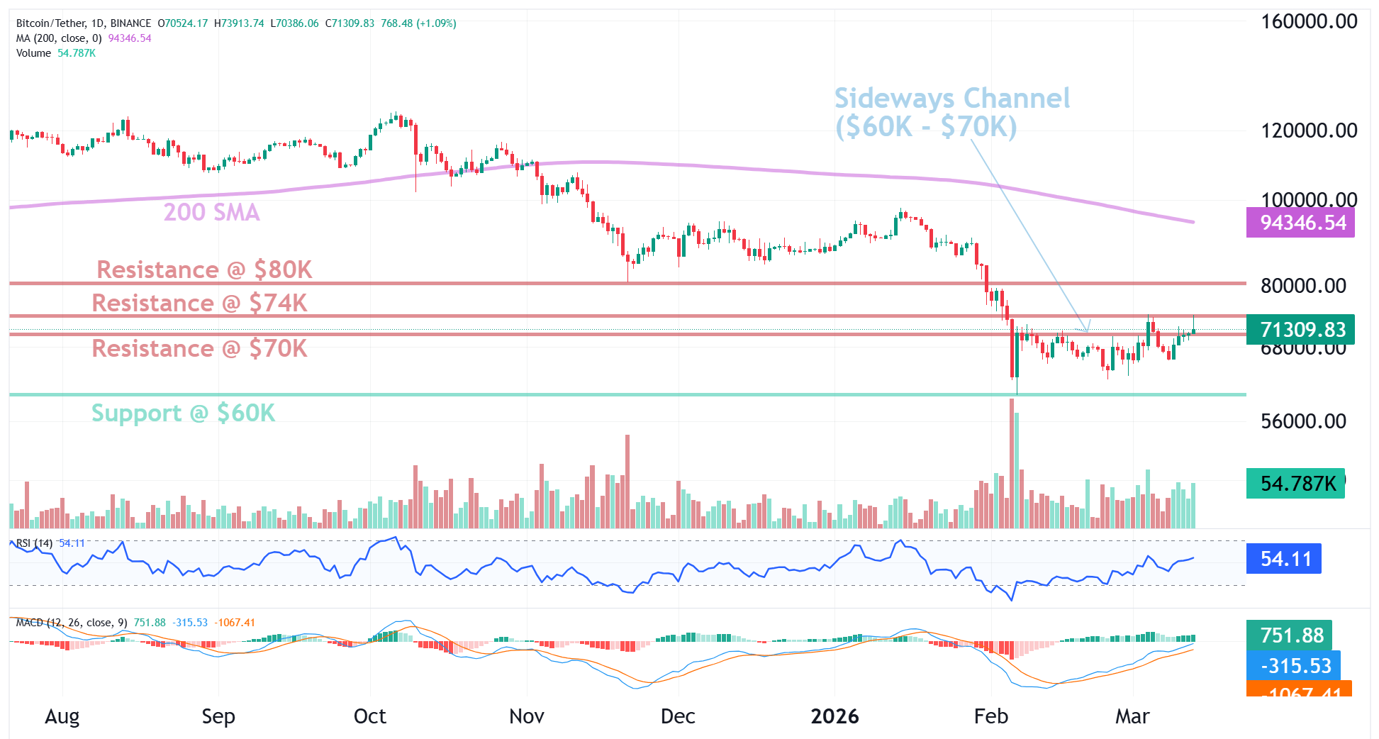 BTC broke through $70K resistance and reached $74K resistance where it appears to have been rejected again. Let’s see if price stays above $70K, which would turn that key level from resistance to support (concept known as polarity).