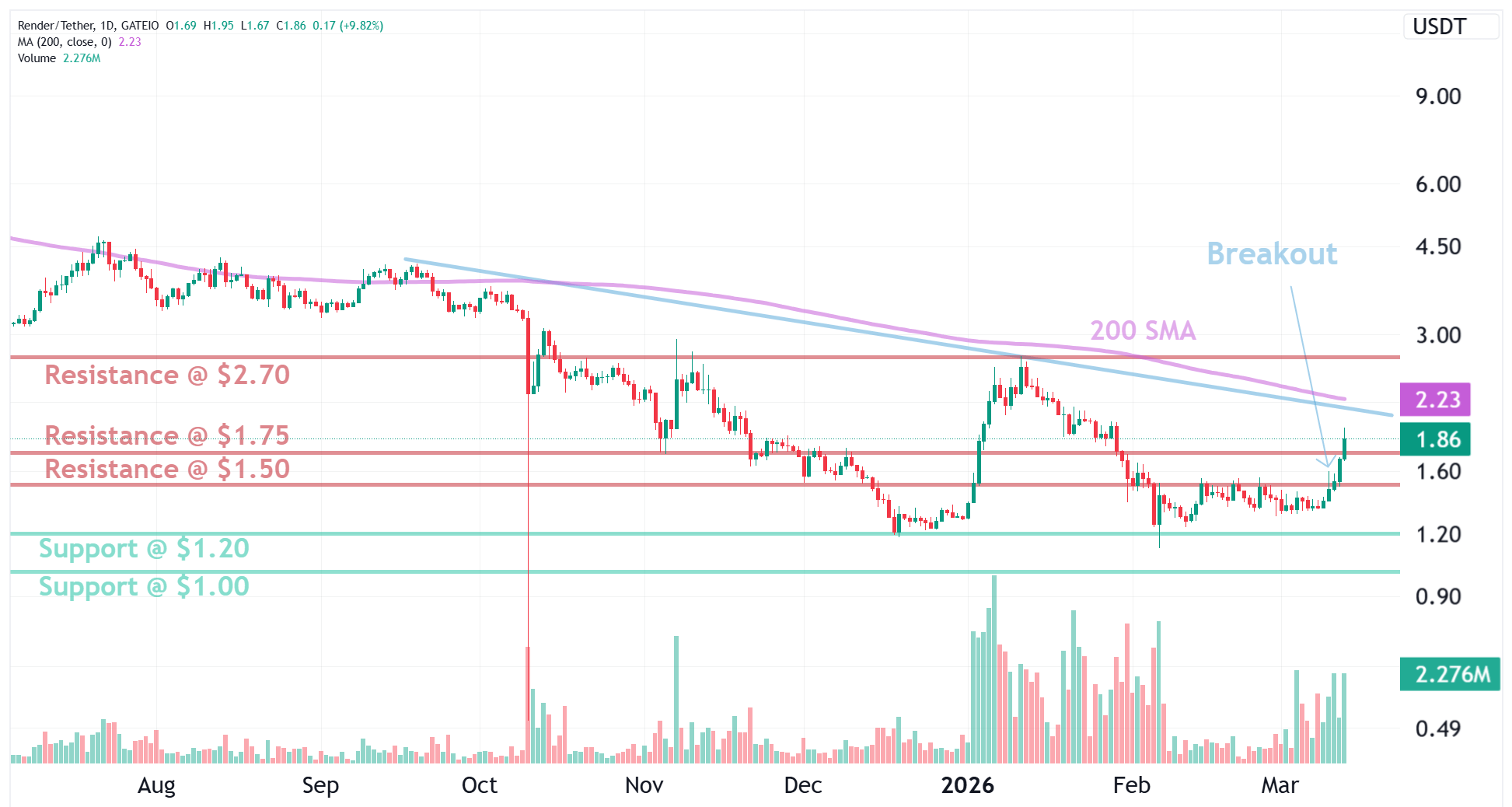 We placed RENDER on our Hot trade setup list after it broke through $1.50 resistance, where it got rejected previously a few times in the last 30 days. That signaled that demand from buyers had finally absorbed supply from sellers and price could advance again.