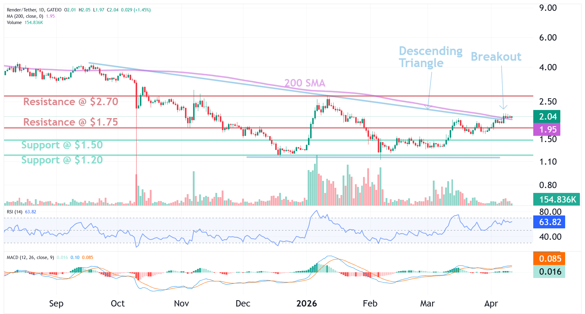 RENDER trade setup: Bullish breakout from Descending Triangle pattern could signal resumption of Uptrend with +25-35% upside potential to $2.50-$2.75 resistance (PT). Stop Loss at $1.68.