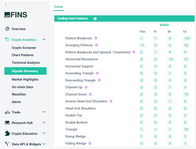 altFINS AI-based Chart Pattern recognition engine identifies 26 trading patterns across multiple time intervals (15 min, 1h, 4h, 1d), saving traders a ton of time, including: