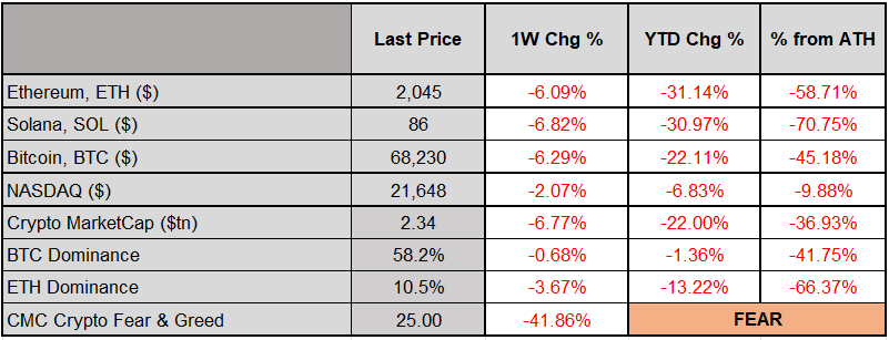 Digital assets sold off this week, with BTC, ETH and SOL down around 6–7%, underperforming the NASDAQ, while overall crypto market cap slipped to about $2.34T and sentiment dropped into Fear at 25 on the CMC index.